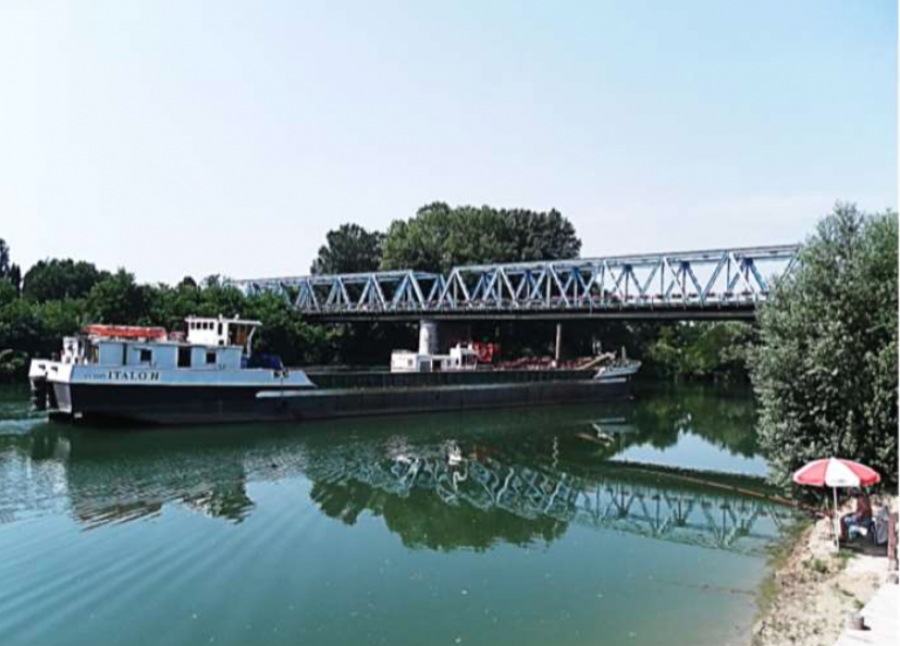 Una grossa chiatta transita sotto il Ponte della Vittoria