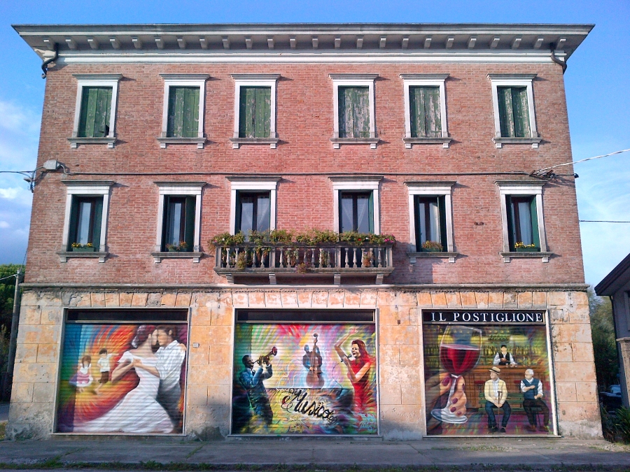 "Trittico" sulla facciata di quello che nell'immediato dopoguerra è stato "Il Postiglione" ... racconta la vita: da bambini >>> alla panchina. Per vedere le 48 foto dall'inizio alla fine, CLICCARE QUI